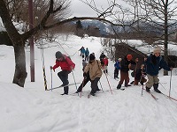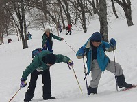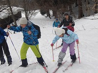 | チャレンジ隊、今回の活動は、クロスカントリスキーに挑戦 | 普通のスキーと違って、ブーツはソフト、かかとが離れて、そして、スキー板が細くて長い。 | まぁまぁ、とにもかくにも、転んでなんぼのスキーなので、 |