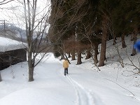 | 2日目、お昼ご飯のオープンサンドや靴下の替えなどをいれたリュックを背負って、ショートツアーに出発。 | 昨日最後にすべった林道からさらに上を目指して、 | スキーをはめたまま、林道を登ります! |
