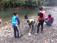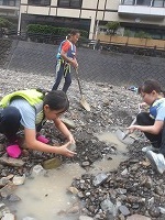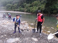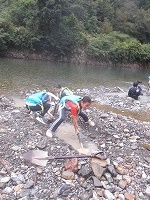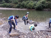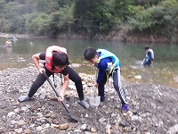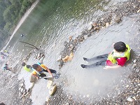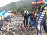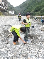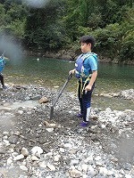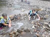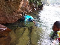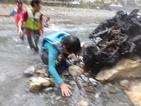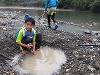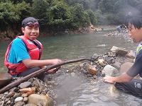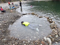 まずは、湯の穴探し。 | 河原といっても、大きな石ころがごろごろしているので、スコップで掘るのは大変。 | 川の中を歩いていると、水の中から出てくる湯の穴発見。 |