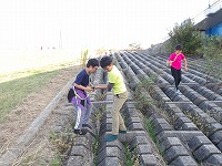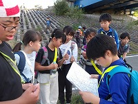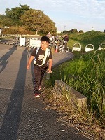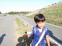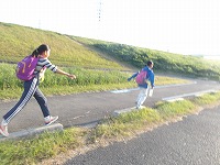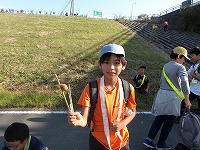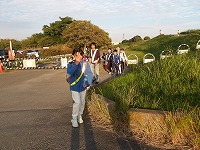 | 再び河川敷に戻った子ども達のペースは上がります | 先についたメンバーが、こっちだよ〜と看板を掲げます。 | 頑張らないと、26.5キロなんて歩けません。 |