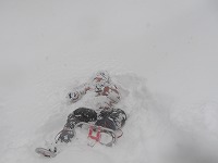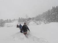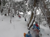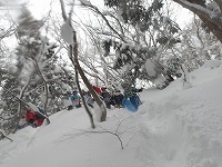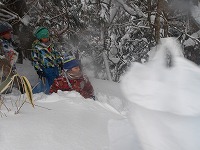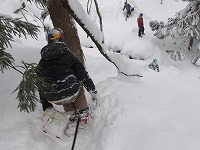| 実は、みんな足にかんじきをつけております。 | かんじきの効果を実感できなーい!と言っておりましたが | かんじきがなかったら、たぶんみんな胸まで埋まるほどの新雪です。 |