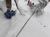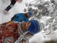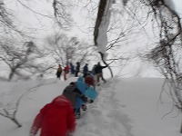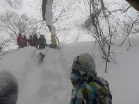 | 先頭は雪をかき分けルートをみつけながら進みます。 | その後ろからどんどん道をつけながら、みんなですすんでいきました。 | 斜面をのぼるのは、大変。キックしてすすむよ! |