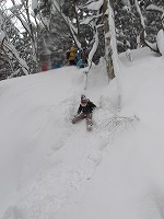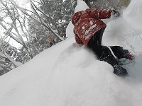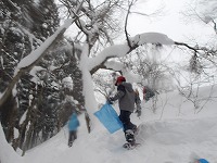 | そしてもうひとつ、下りは、おしりで滑っておりられる。 | スノーシューハイキングの楽しさです。 | ずっと、先頭、じょうずなルートどりでした〜 |