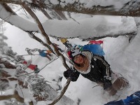 | そして、10キロ地点スタート。いってらっしゃーい!またあとでね〜! | 沢に降りていくと、沢の水が凍ったアイスブリッジ発見。 | 安全を確認してひとりひとりおそるおそるわたるのも、また楽しい、 |