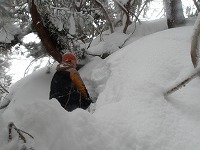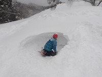| さぁ、みんなが待つ場所が見えてきたぞ〜 | 上で待つみんなと合流です。 | 上では、みんな穴を掘っておりました。大きな大きな横型の雪洞 |