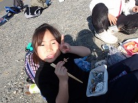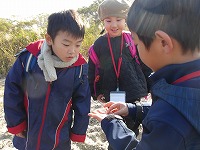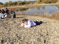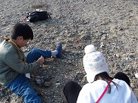 | ふぅ、気持ちいい! | 休憩ですが、子ども達はあっちへこっちへ大忙し、魚をみつけたり、漂流物を見つけたり、 | 全開の化石堀と同じく、石をみつけたら割ってみると、 |