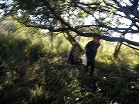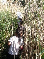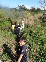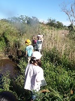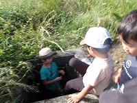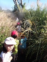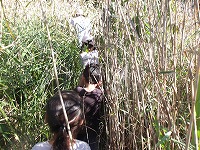 みんなの背丈の倍以上もあるカヤの中。水が流れていく方へ進めばいい!と子ども達。たくましいなぁ〜、 | おーい、どこにいる〜 | 最後、ジャングルのようなところについて、まだまだ先に進みたかったのですが、帰る時間。ざんねん!! |