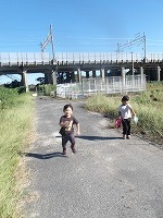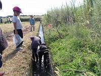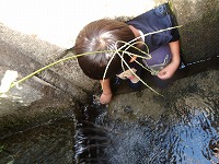 カエルがおりました。 | ひとしきりカエルさがしをしたので、さぁ水路へ。ところが途中、草が生い茂り、会えなく断念 | 別の水路を進んでいくと、 |