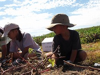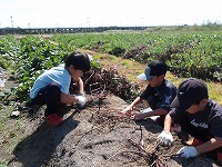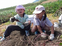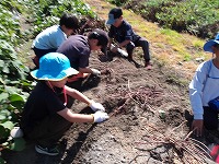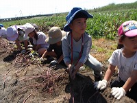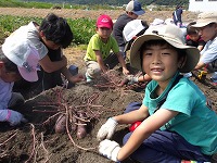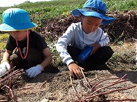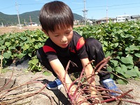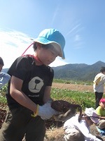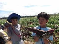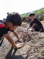 まずは、さっそくおいもほり。 | どこにおいもがかくれているの? | あったあった!おいもが見えてきました。 |