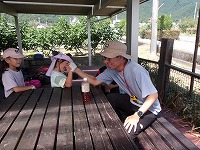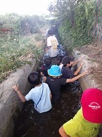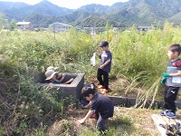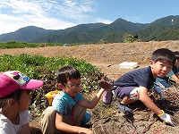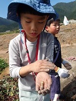 途中スタッフに手伝って〜ということがありましたが、「ええ、本当にいいん?掘るの楽しいねんな〜」というと、「いやいややっぱり自分で掘るわ」と子ども達。 | やっぱり自分で掘りたいのです。 | オケラをみつけたり、カエルや芋虫、何かの幼虫、いろんな生き物を見つけておりました。 |