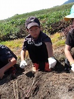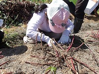 ところが、今年のおいもは手ごわい。 | ほっているうちに、土がどんどんしまってきて、なかなか掘り進めません。 | それでもこつこつ頑張るのですが、 |