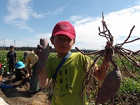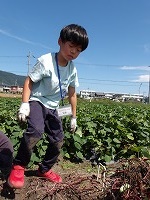 とても長い間格闘して、無事お芋が出てきました。 | 立派な立派なお芋です。 | 自分で掘ったお芋の中から、二つお土産にして、残りは、次の活動で焼き芋にすることにしました。楽しみ楽しみ! |