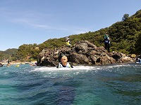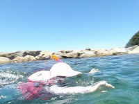 日差しは強いですが、水の中に入っていると丁度良いくらい。 | 天気がよくて良かった〜。 | ちょっと沖にある岩まで泳いでいって、 |