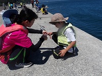 一年生から中学生までのお友達が、 | 自分で竿をセットして、 | しかけのセットも、釣れた魚を外すのも、餌を入れるのも頑張って自分で挑戦。 |